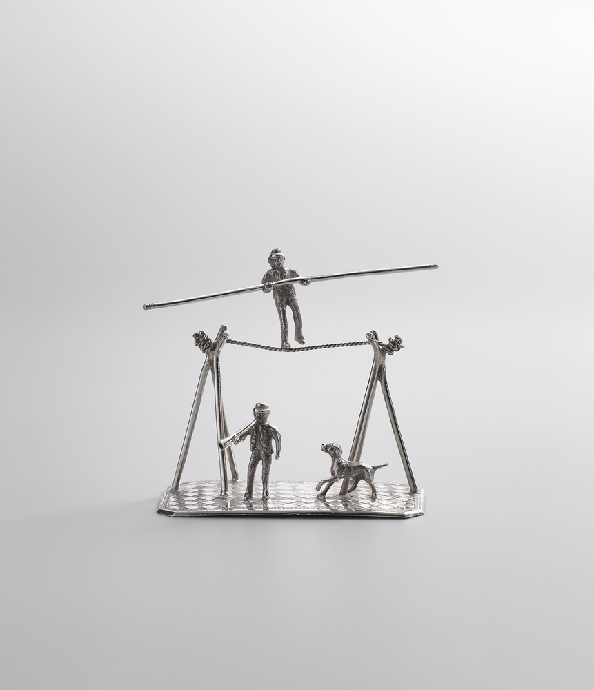 Kermissen en jaarmarkten waren de plekken bij uitstek waar acrobaten en andere potsenmakers hun halsbrekende toeren uitvoerden. Deze miniatuur beeldt een evenwichtskunstenaar af die met een stok over het dunne touw loopt. Op straat beneden hem staat een omroeper met zijn toeter publiek te werven. Een hond blaft tegen de omroeper. Kinderen imiteerden volwassen spelletjes als deze, maar dan veel lager bij de grond. Op die manier was dansen op het slappe koord minder gevaarlijk. ( Bert Vreeken)