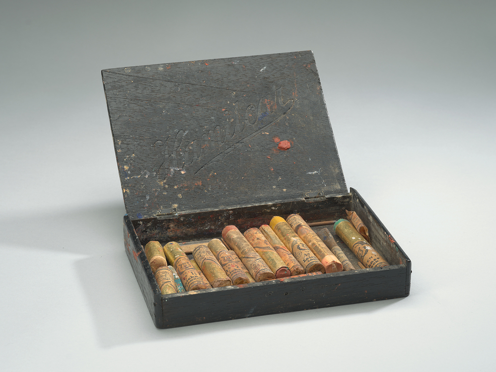 Zwarte doos met vetkrijt als inhoud. Opschrift deksel: GREASE PAINT.- Trefwoorden