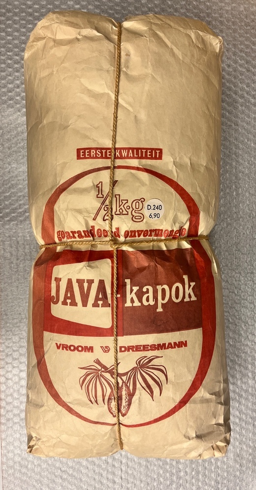 De eerste V&D-winkel werd in 1887 geopend, maar het eerste grote warenhuis verrees in 1912 op de Kalverstraat . Deze formule werd de trendsetter; voor kleine zaakjes was geen plek meer. Het succes kwam mede door de gunstige concurrentiepositie, die mogelijk werd gemaakt door het groot en scherp inkopen rechtstreeks bij fabrikanten. Goederen vanuit de hele wereld werden toegankelijk voor Nederlandse consumptie. Zo ook deze zak Java-Kapok die voor de prijs van 6 gulden 70 gekocht kon worden.