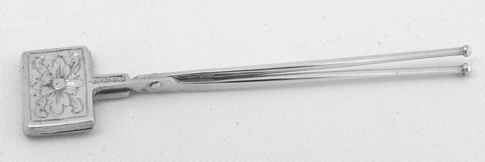 Wijfelijzer met twee rechthoekige platen die aan beide zijden zijn gegraveerd met bloemmotief binnen een kader, binnenzijde met wafelpatroon, geklonken draaipunt, platte benen verlopend naar rond eindigend in een enkele knop.
