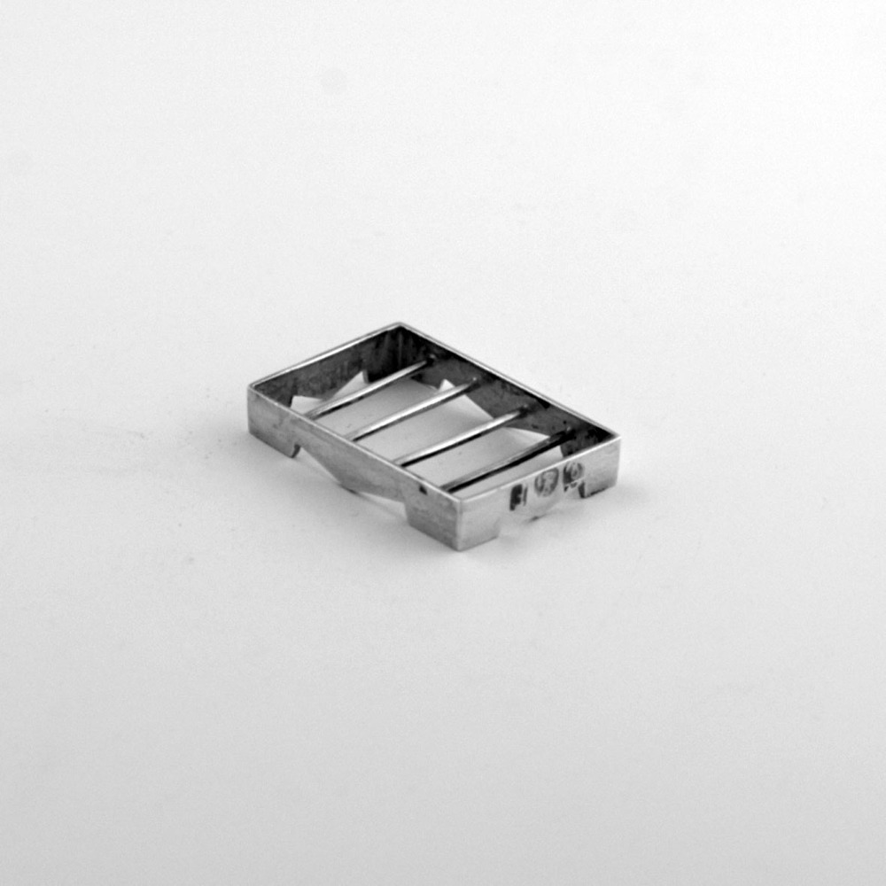 Lage rechthoekige treeft met omgekeerd-tympaanvormige luchtopeningen, twee gegraveerde lijnen over de vier zijden en vier spijlen.
