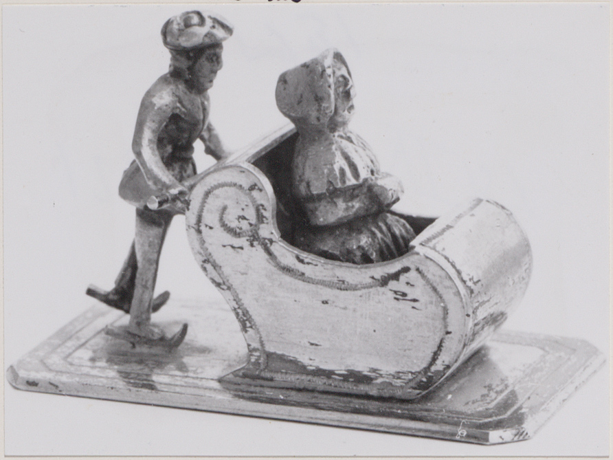 - Duwslee op grondplaat met vrouwfiguur waarachter een duwende man op schaatsen., 1890 - 1920