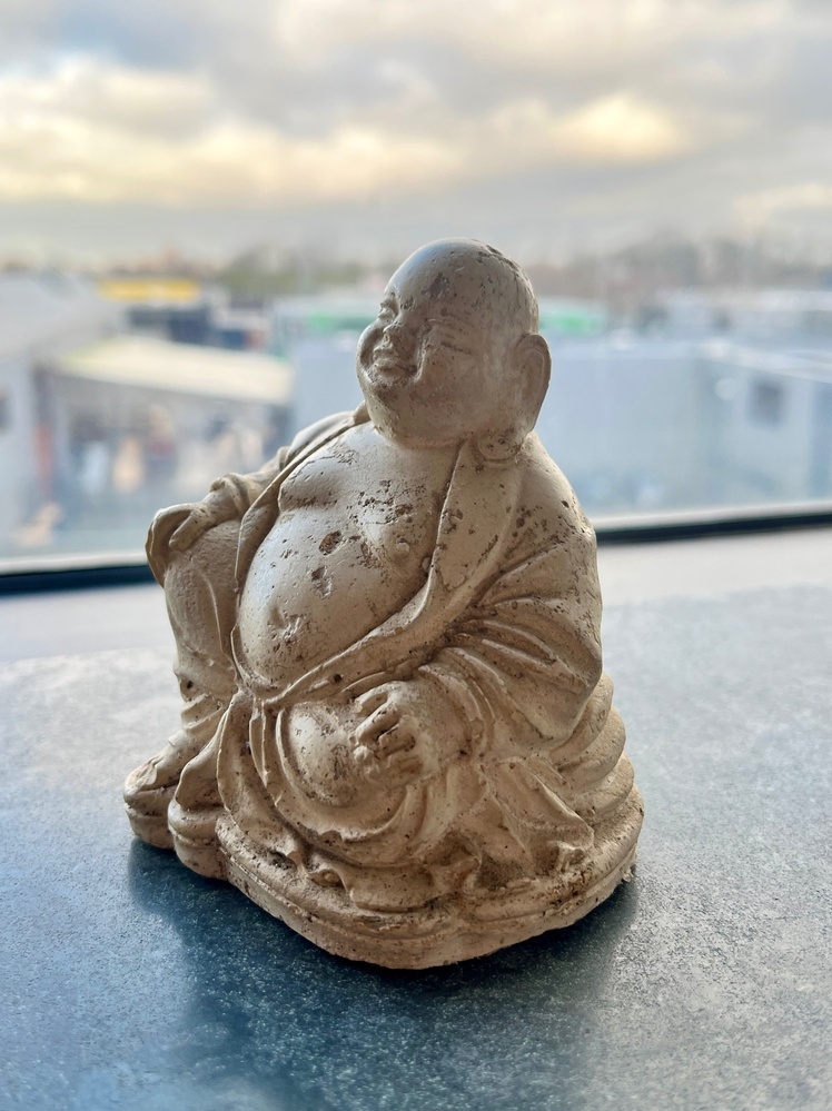 Gipsen beeldje van zittende boeddha. Op onderzijde in zwarte viltstift tekst: "Dank je wel/ Peter!/ Stay Strong/ We [hartje] you!/ m.&m.
