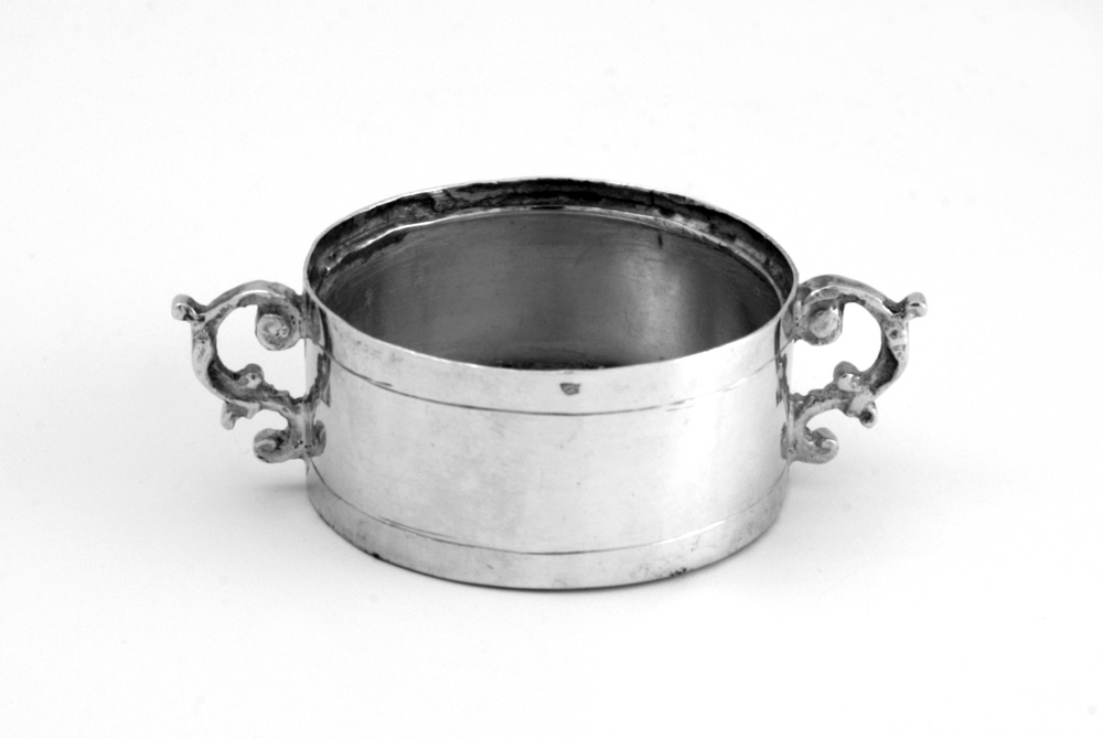 Cilindrische ketel met gladde wand waarop twee bandgraveringen, twee gekrulde S-vormige oren en een deksel met sluitrand op de binnenzijde.- Trefwoorden