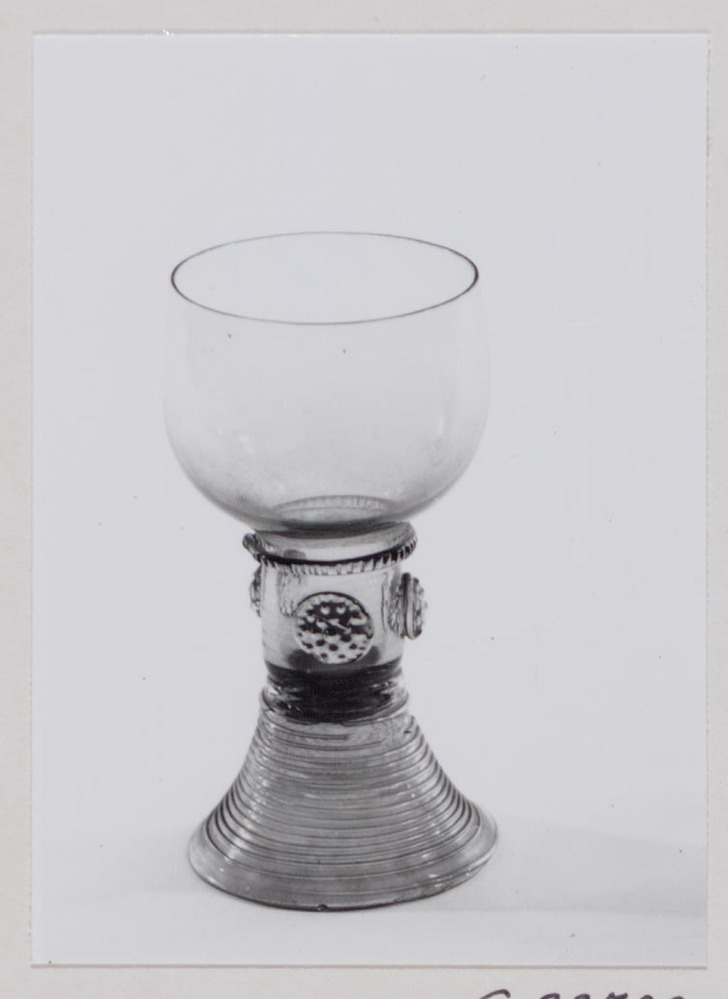 Helder geelgroen glas. Vlakke bodem. Concaaf- conische voet van gesponnen glasdraad. Cilindrische schacht met enkele rij braamnoppen, aan één stuk geblazen met bolvormige kelk. Geribde glasdraad op overgang schacht en kelk.- Trefwoorden