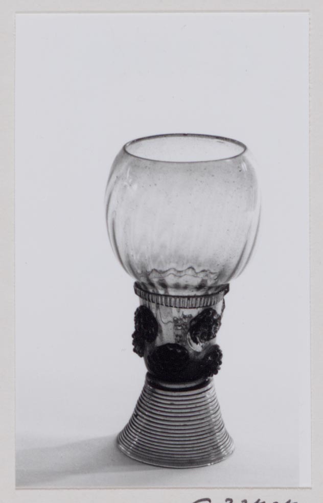 Helder groen glas. Ingestoken bodem. Conische voet van gesponnen glasdraad. Cilindrische schacht met twee rijen braamnoppen, aan één stuk geblazen met bolvormige kelk. Schacht en kelk met in de vorm geblazen verticale ribben. Geribde glasdraad op overgang schacht en kelk.
