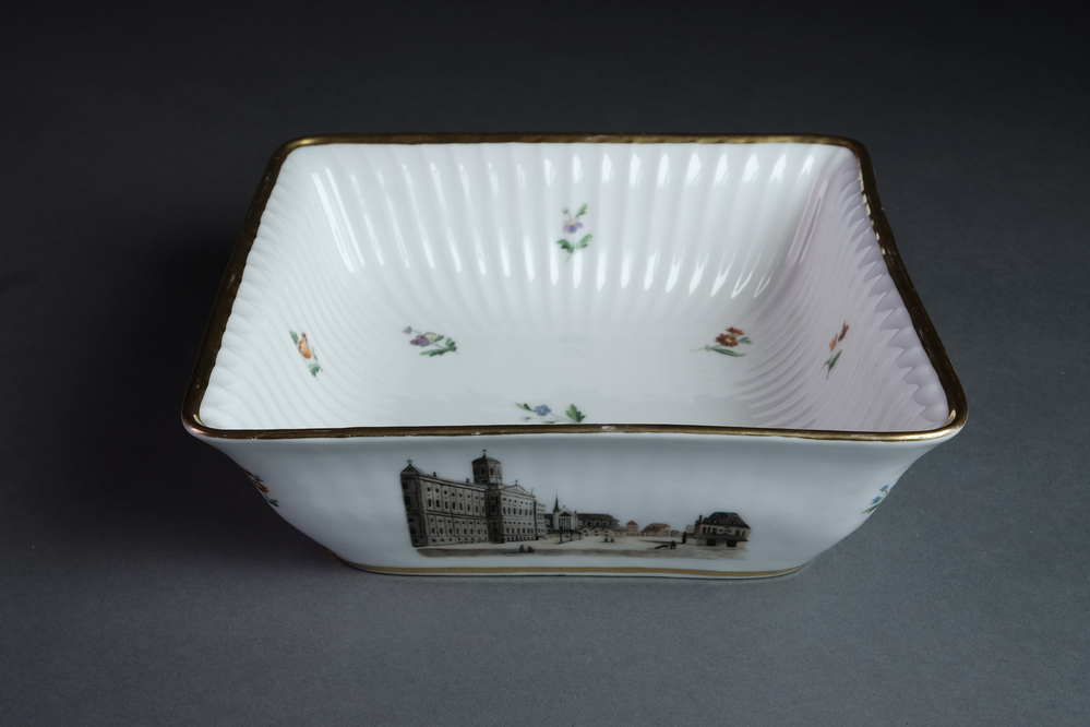 Schaal, vierkant, met afbeeldingen van Amsterdamse gebouwen.- Trefwoorden