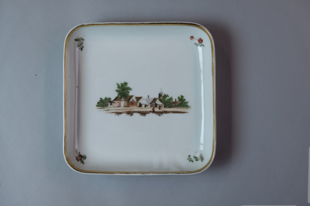 Vierkante schaal met een afbeelding van een historisch dorpsgezicht of gebouw.- Trefwoorden