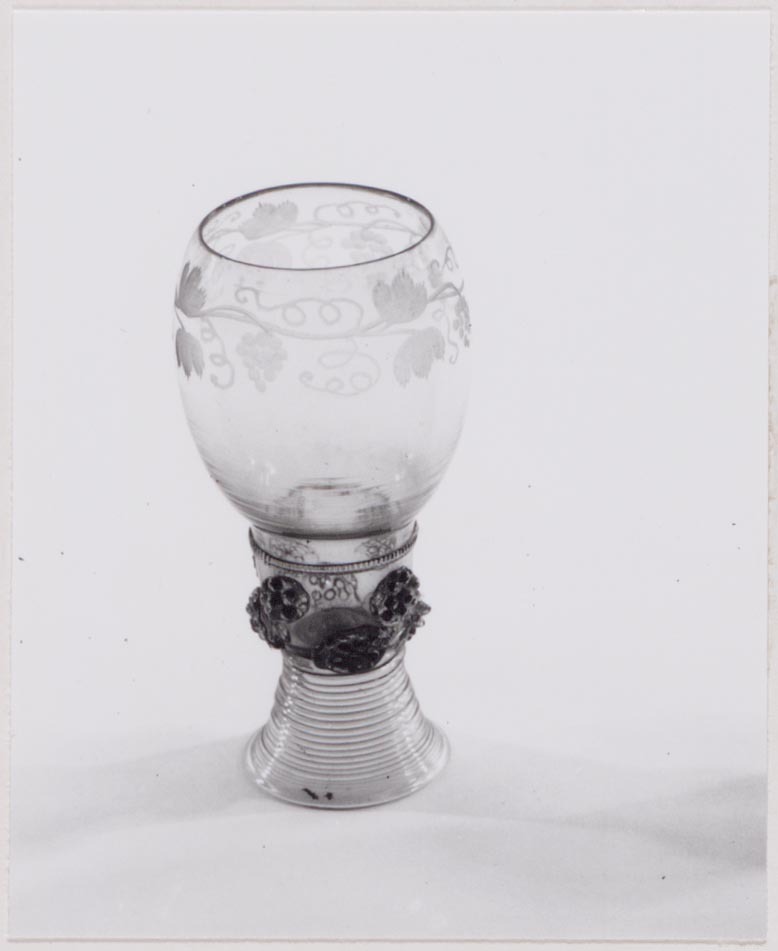 Helder lichtgroen glas. Ingestoken bodem. Conische voet van gesponnen glasdraad. Cilindrische schacht met twee rijen braamnoppen, aan één stuk geblazen met eivormige kelk. Geribde glasdraad onder overgang schacht en kelk. Rondom kelk druivenranken.- Trefwoorden