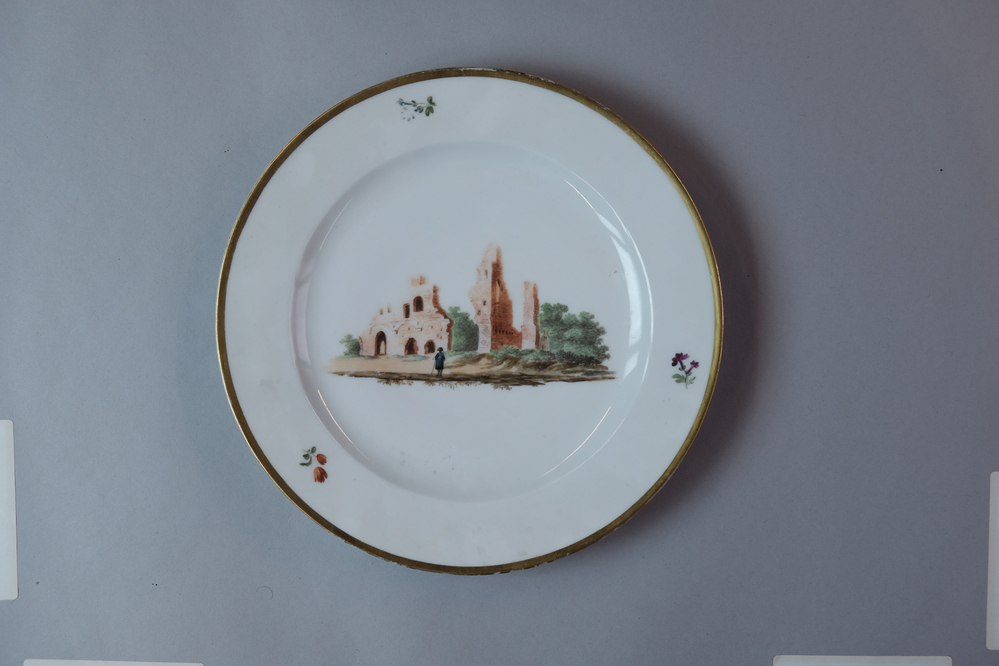 Bord met afbeelding van de overblijfselen van de abdij Rijnsburg (1756).- Trefwoorden
