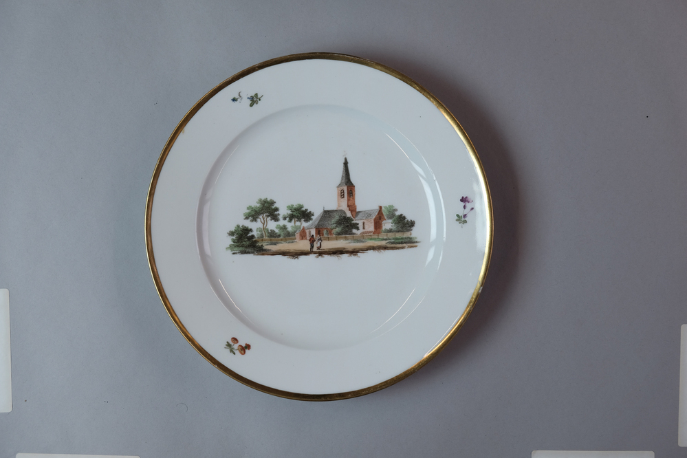 Bord met afbeelding van de abdijkerk te Rijnsburg (1756).- Trefwoorden