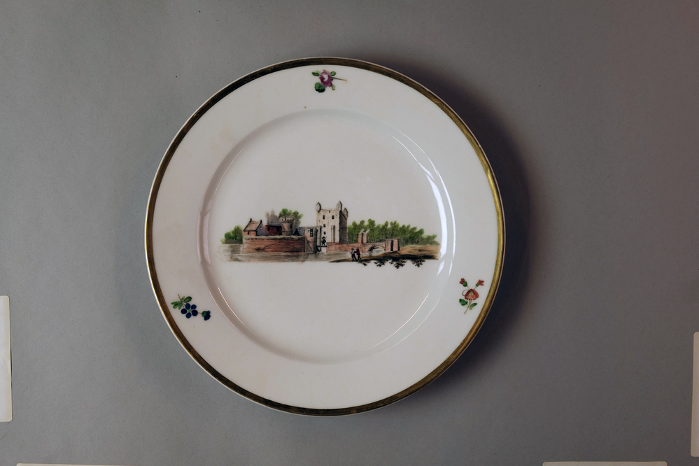 Bord met een afbeelding van een historisch dorpsgezicht of gebouw.- Trefwoorden
