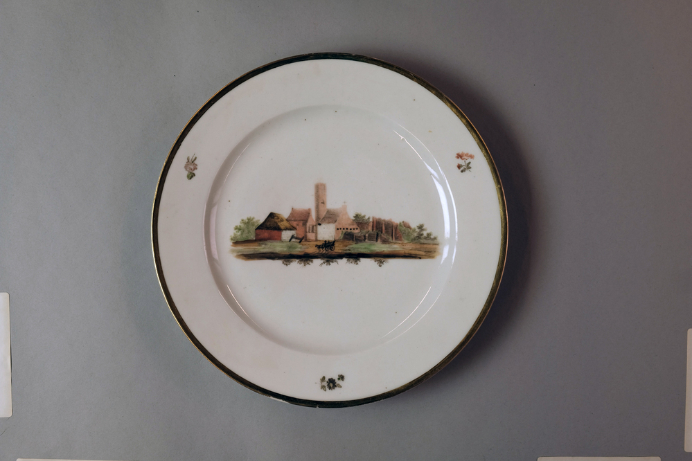 Bord met een afbeelding van een historisch dorpsgezicht of gebouw.- Trefwoorden