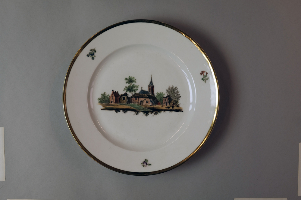 Bord met een afbeelding van een historisch dorpsgezicht of gebouw.- Trefwoorden