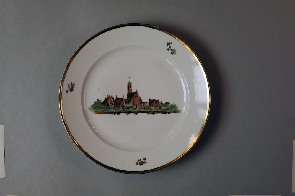 Bord met een afbeelding van een historisch dorpsgezicht of gebouw.- Trefwoorden
