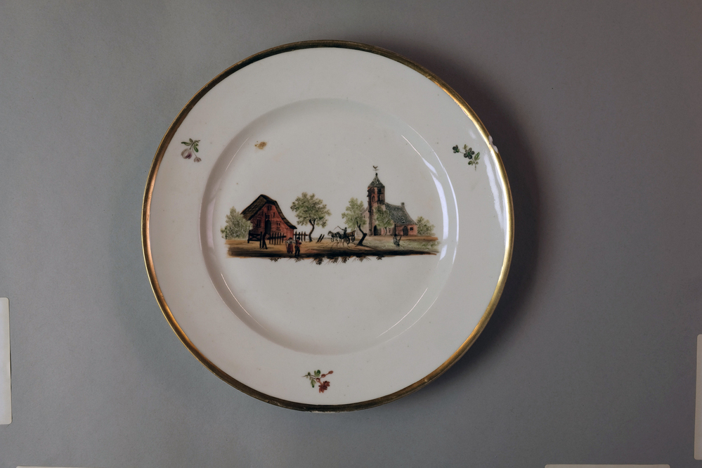 Bord met een afbeelding van een historisch dorpsgezicht of gebouw.- Trefwoorden