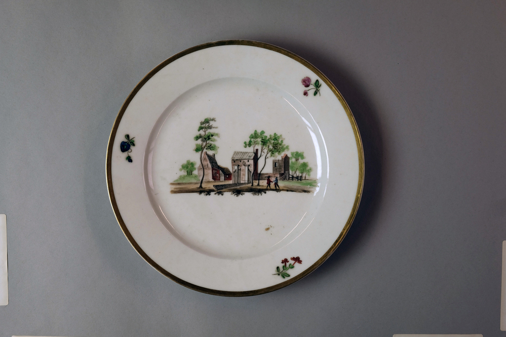 Bord met een afbeelding van een historisch dorpsgezicht of gebouw.- Trefwoorden