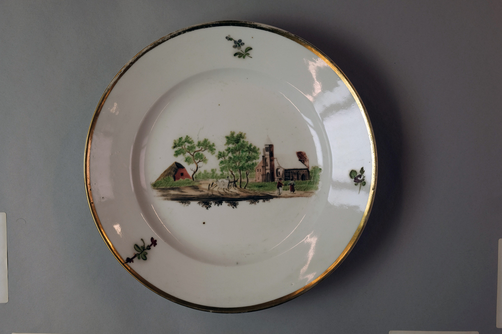 Bord met een afbeelding van een historisch dorpsgezicht of gebouw.- Trefwoorden