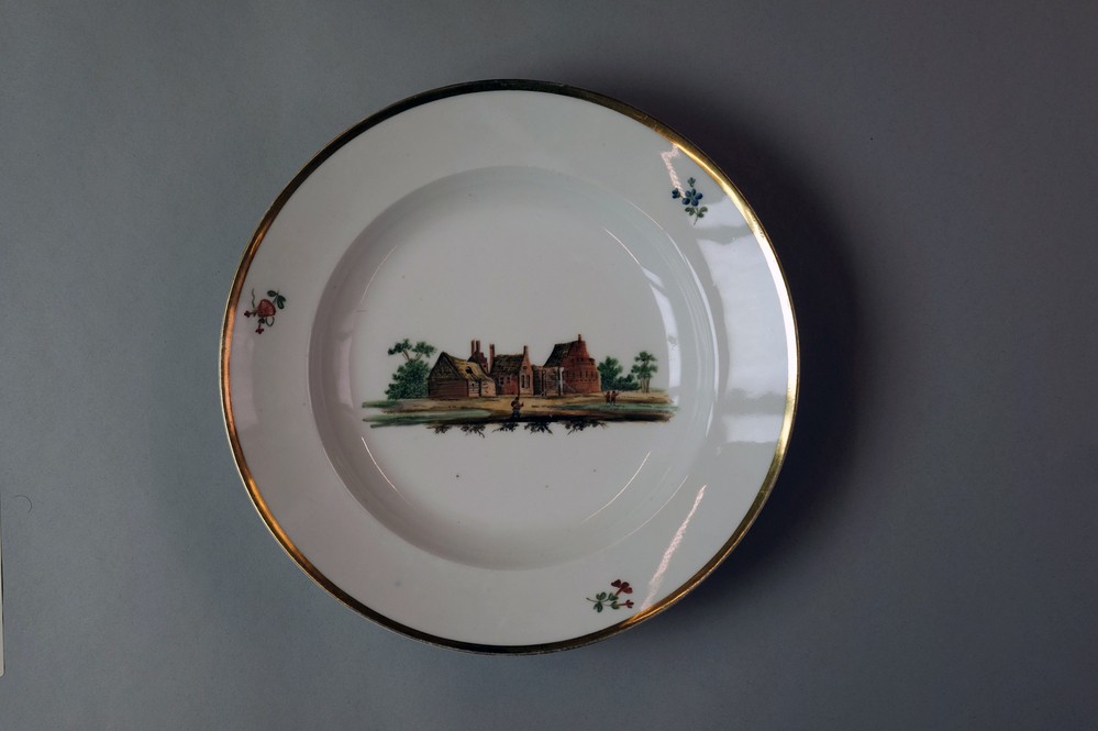 Diep bord met een afbeelding van een historisch dorpsgezicht of gebouw.- Trefwoorden
