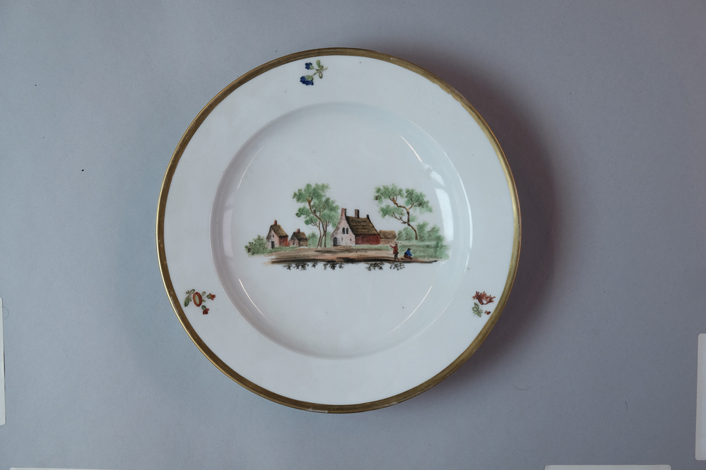 Diep bord met een afbeelding van een historisch dorpsgezicht of gebouw.- Trefwoorden
