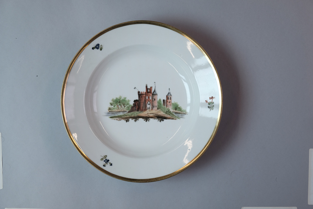 Diep bord met een afbeelding van een historisch dorpsgezicht of gebouw.- Trefwoorden