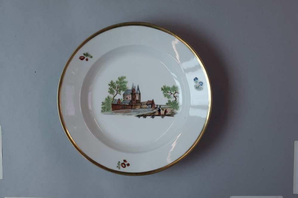 Diep bord met een afbeelding van een historisch dorpsgezicht of gebouw.- Trefwoorden