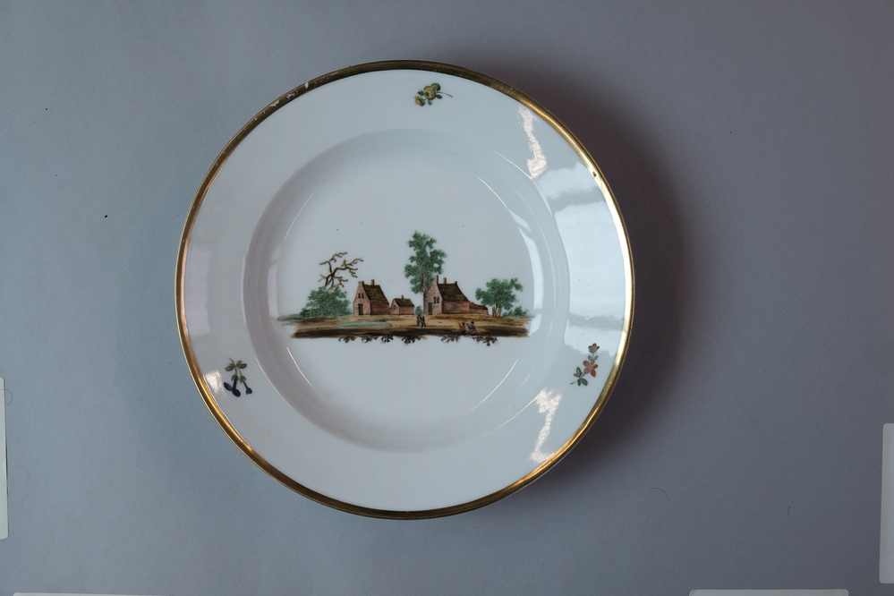 Diep bord met een afbeelding van een historisch dorpsgezicht of gebouw.- Trefwoorden