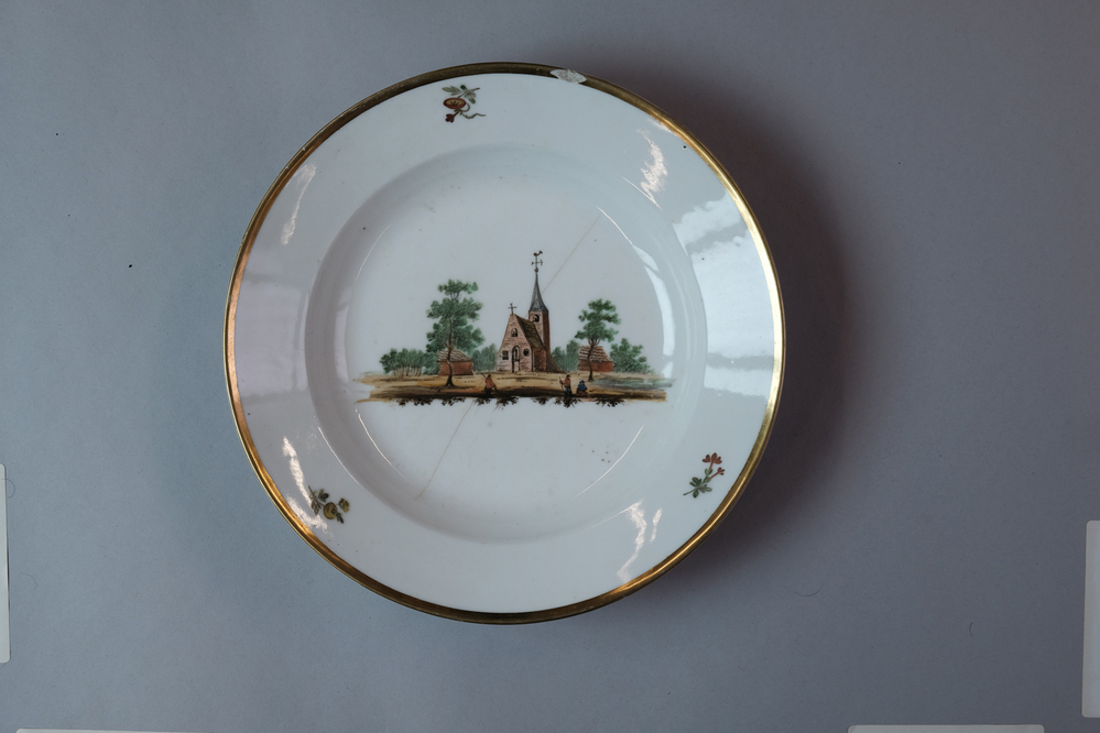 Diep bord met een afbeelding van een historisch dorpsgezicht of gebouw.- Trefwoorden