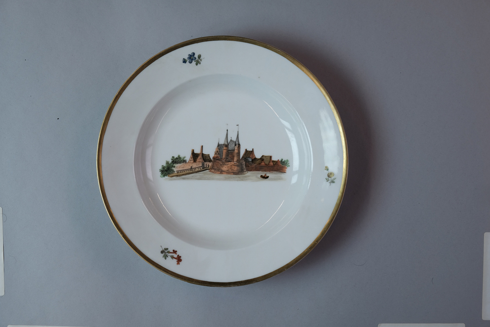 Diep bord met een afbeelding van een historisch dorpsgezicht of gebouw.- Trefwoorden