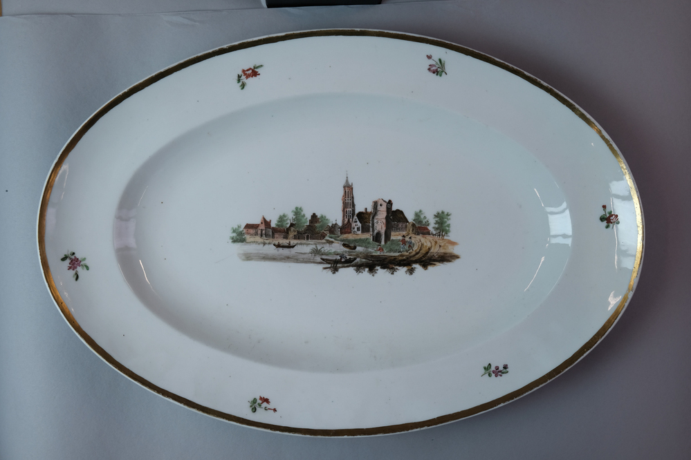 Zeer grote ovale schaal met een afbeelding van een historisch dorpsgezicht of gebouw.- Trefwoorden