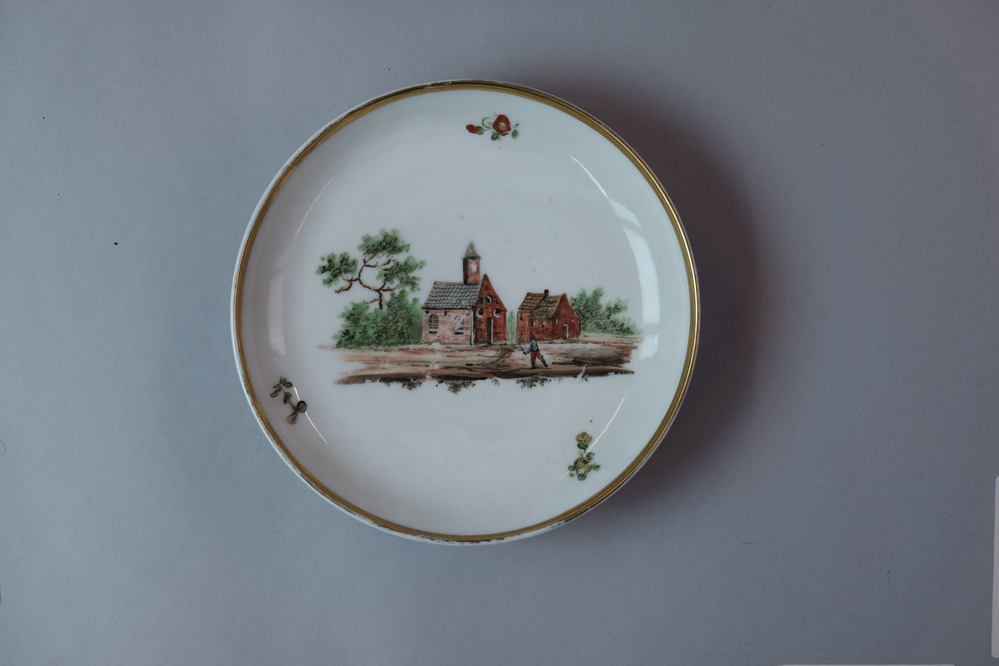 Ronde schaal met een afbeelding van een historisch dorpsgezicht of gebouw.- Trefwoorden