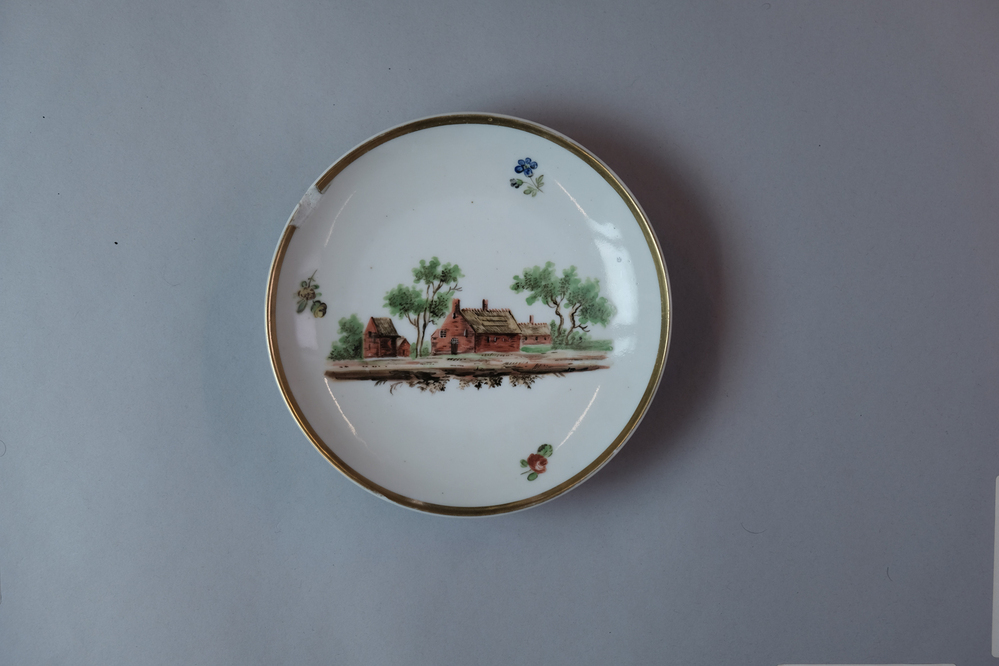 Ronde schaal met een afbeelding van een historisch dorpsgezicht of gebouw.- Trefwoorden