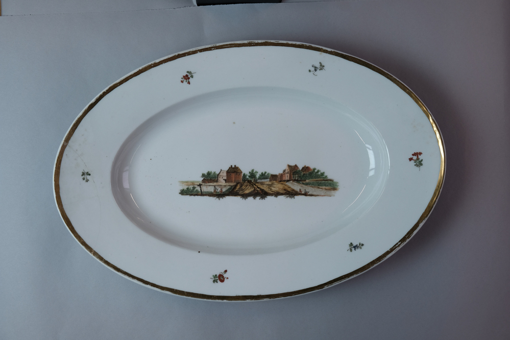 Grote ovale schaal met een afbeelding van een historisch dorpsgezicht of gebouw.- Trefwoorden