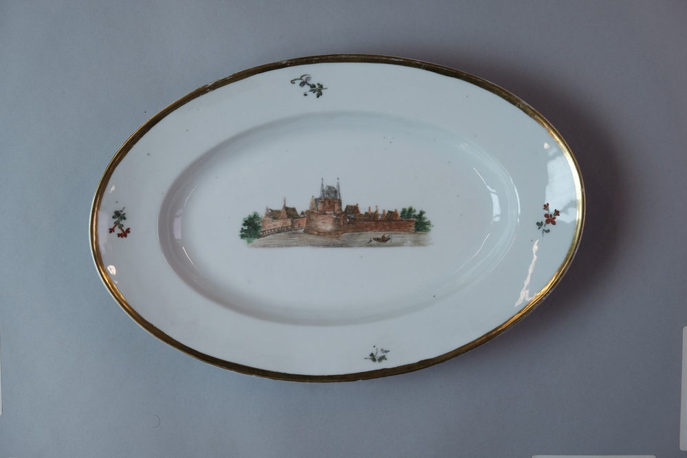 Ovaal schaaltje met een afbeelding van een historisch dorpsgezicht of gebouw.- Trefwoorden