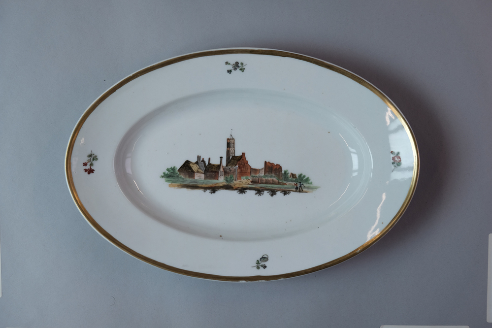 Ovaal schaaltje met een afbeelding van een historisch dorpsgezicht of gebouw.- Trefwoorden