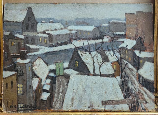 Amsterdam in de winter, vanaf de Admiraal de Ruijterweg in zuidelijke richting, met rechts de Slatuinenweg en in het midden de Kostverlorenvaart, de IJzergieterij en Machinefabriek N.V. J. Zimmer en Zonen aan de overkant.