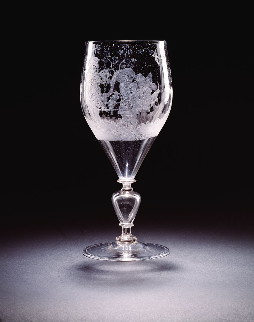 De initialen van de glasgraveur zijn te lezen als: Cf[ecit]M. Andere interpretaties zijn: CJM, CFM en fcM [fecit M] (Ritseman van Eck 1995, p. 470). Er zijn dertien door Meester CM gesigneerde glazen bekend, waarvan twee in de verzameling Willet-Holthuysen (Smit 1994, p. 92). De valkenier met het valkenrek en de ruiter zijn gebaseerd op een prent van Jacob Cats (1577-1660), 'Spiegel vanden ouden ende nieuwen tijdt' (1632) (Amsterdams Historisch Museum, inv. nr A 15105). Het betreft een embleemprent met het motto: Elck meynt sijn uyl een valck te zijn/. De uilen van de prent zijn op het glas vervangen door valken. De twee jagers met hond zijn gebaseerd op een detail van een prent van Antonio Tempesta (1555-1630), uit de serie Aucupationis MultifariÆ Effigies, uitgegeven door Claes Janz Visscher (1609) (Graphische Sammlung Albertina, Wenen, inv. nr 4D.24). ( Bert Vreeken)