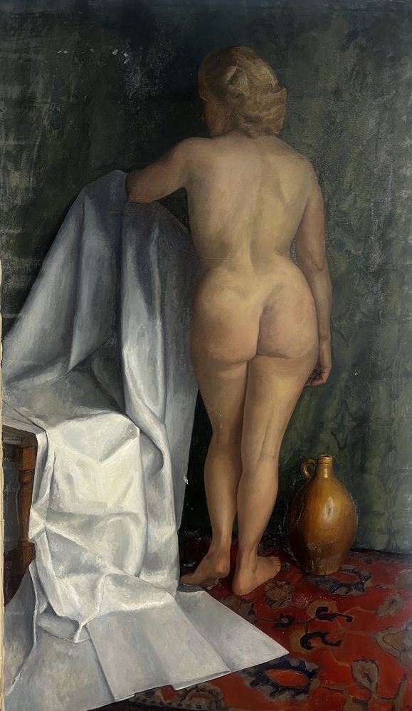 Schilderij met lijst met hierop een naakte vrouw, van achterzijde gezien.- Trefwoorden