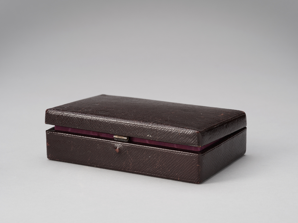 Kistje met deksel, bekleed met bruin leer. Geen inhoud. Aan binnenzijde twee langwerpige compartimenten, bekleed met kunstzijde en fluweel.- Trefwoorden