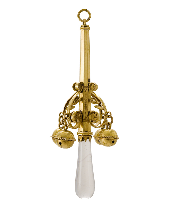 Gouden rammelaar, staafvorm, in 8 facetten met een ring aan de bovenkant. In het onderste deel een gegraveerde bloemdecoratie en rondom vier S-vormige consoles met bloemkopjes en spiralen met afhangende belletjes met een kabelrandje over het midden. Gepunte inzet met een bijstuk van kristal.
