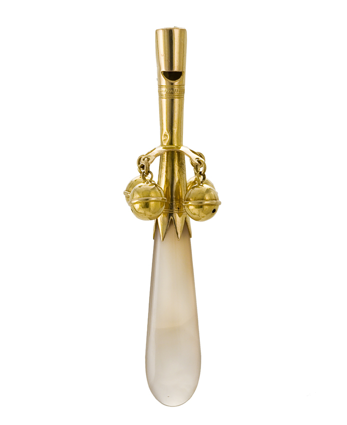 Gouden rammelaar met fluitje, staafvorm, concaaf-cilindrische as en fluit met gegraveerde bandjes en gepunte overgang naar het bijtstuk van halfedelsteen. Schermpje met vier belletjes.- Trefwoorden