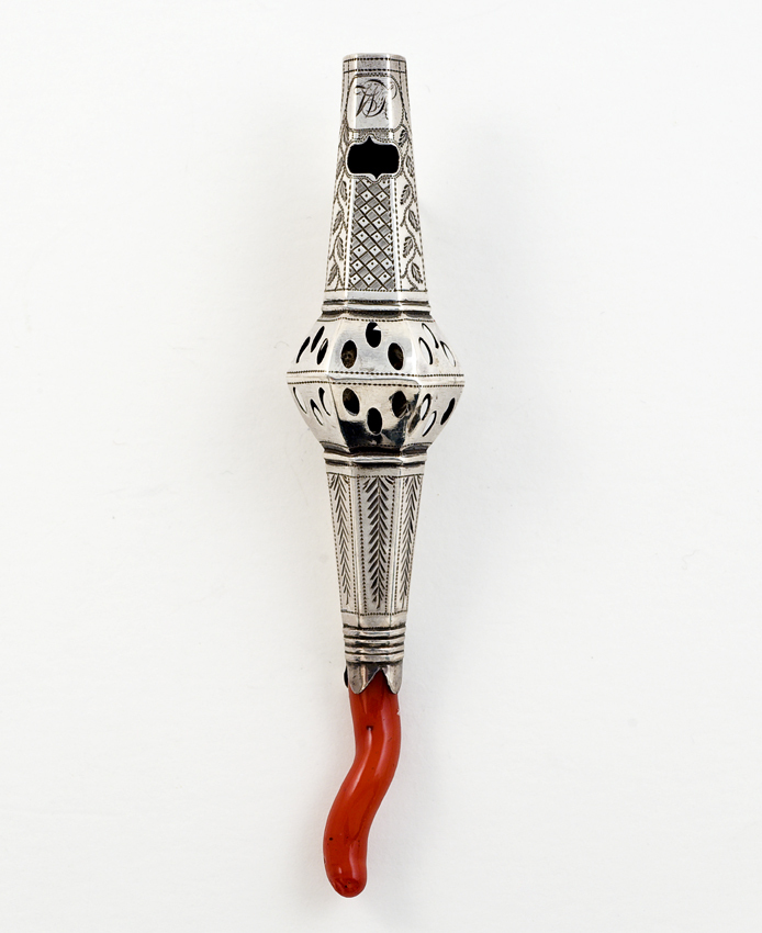 Zilveren rammelaar, zeskantige as waarvan de facetten versierd zijn met een gegraveerde decoratie van ruiten, bladranken en geometrisch motief en in het midden een opengewerkte, zeskantige bol. In het mondstuk van de fluit een uitsparing met de het verstrengelde monogram WJ. Bijtstuk van bloedkoraal.