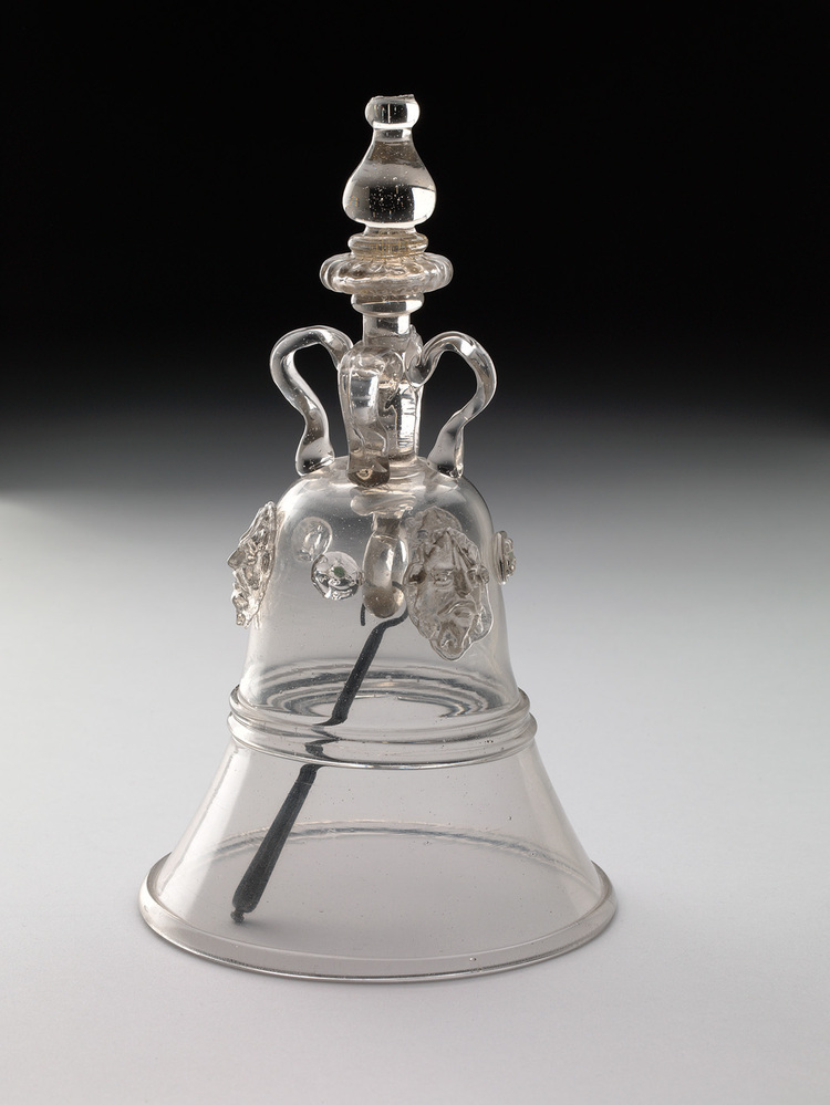 Helder kleurloos, rookkleurig getint glas, opaak turkoois glas. Klokvormige kelk met omgeslagen rand en opgelegde, dubbele glasdraad. Op schouder alternerend drie mannenmaskers en drie noppen met kern van turkoois glas. Samengestelde greep met vier lussen, geribde knoop en balustervormige knop. Sporen van verguldsel op geribde knoop en glasdraad. In bel een glazen ring met zilveren klepel van later datum.