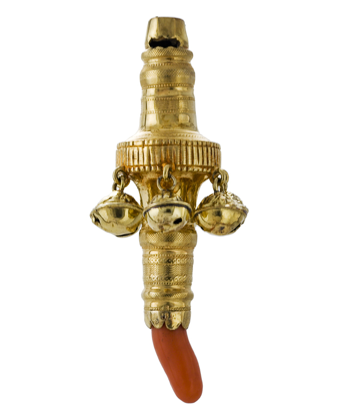 Gouden staafvormige rammelaar met fluitje en bloedkoralen bijtstuk. De trommelvormige nodus is voorzien van een verticale lijnprofilering en rondom oogjes met drie grote en drie kleinere bellen. Het geheel is voorzien van fijne gegraveerde decoraties en een geschulpte stokzetting.