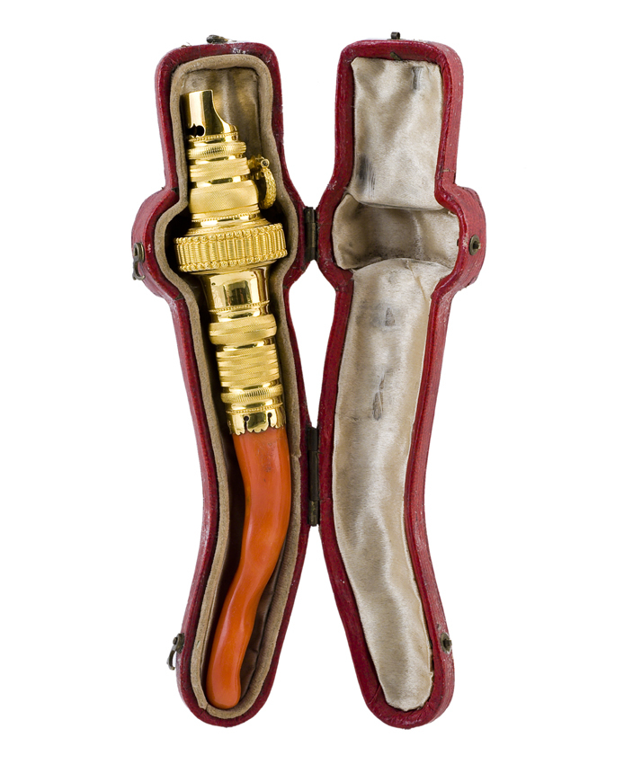 Fluit van verguld zilver, trommelvorm met oogje en grillig gevormde bijtstuk van bloedkoraal en originele rood leren foedraal.