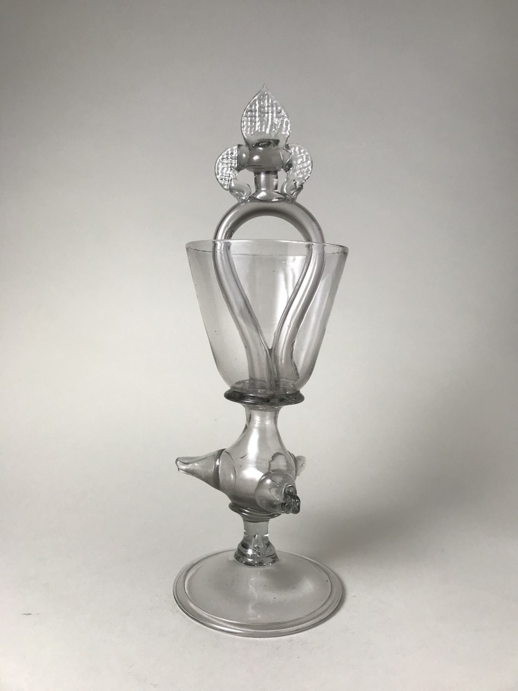 Het niet nauwkeurig volschenken van het glas kon een hevelwerking op gang brengen waardoor de wijn via de tuitjes in de stam naar buiten liep. Zie voor een soortgelijk glas: Catalogus 1962, p. (23) afb. 10; Glas 1991, p. 116 nr 12, p. 117 afb. 112. ( Bert Vreeken)