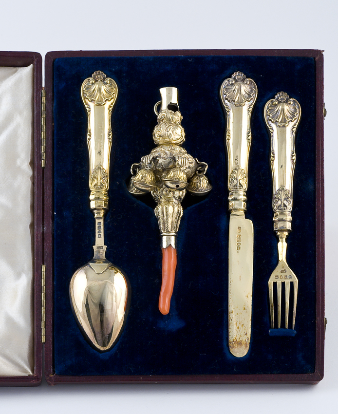 Verguld Victoriaans kinderbestek met rammelaar met bijtstuk van bloedkoraal in origineel foedraal, 1839