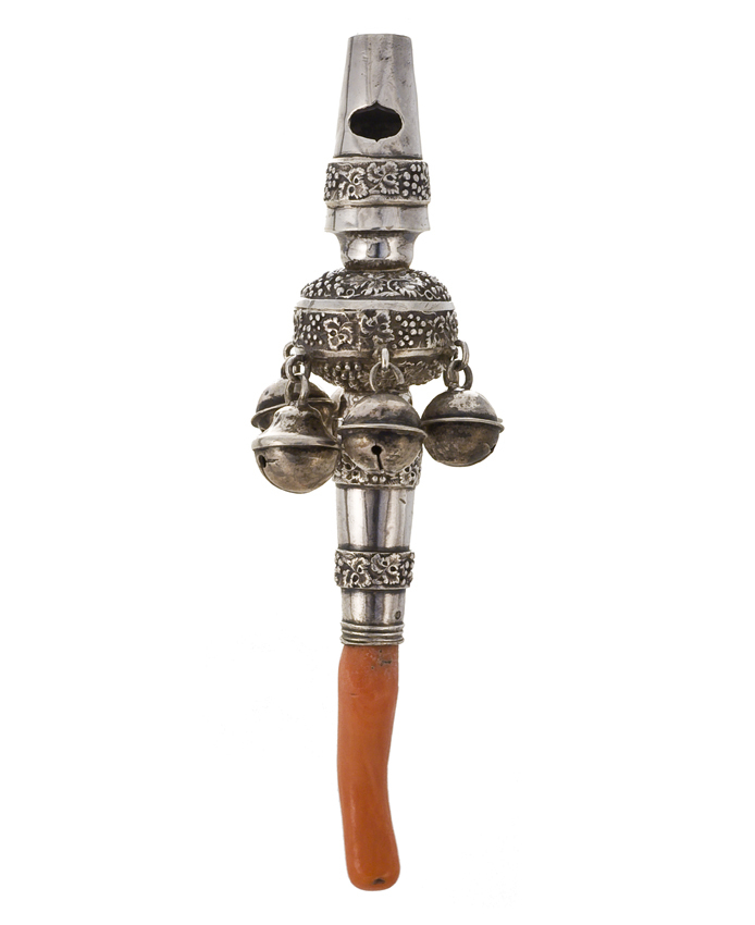 Zilveren rammelaar met fluit, bolvormig middendeel. De rammelaar is afwisselend glad en versierd met een oorspronkelijk vergulde decoratie. Rond het midden hangen zes bellen waarvan één afwijkend in vorm. Het bijtstuk van bloedkoraal is bijgesneden om het passend te maken.
