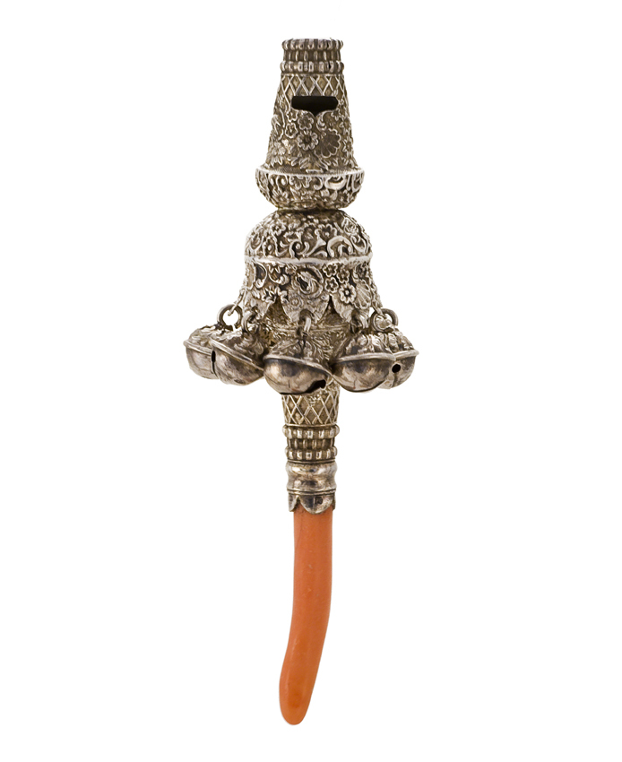 Zilveren rammelaar met fluit en sporen van verguldsel, klokvorm, rijk bewerkt met een geschulpte rand met acht afhangende bellen. Bijtstuk van bloedkoraal.