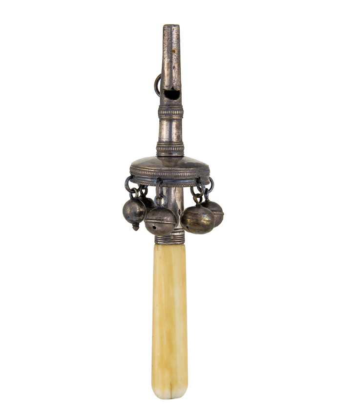 Zilveren rammelaar met fluitje, ronde as en ronde schermvorm, het geheel versierd met bandjes. Vijf van de zes bellen waarvan vier verschillende soorten en steel van been.- Trefwoorden
